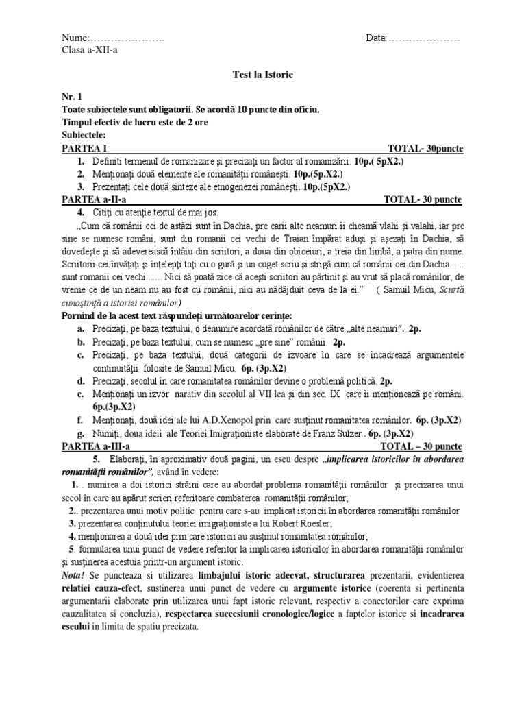 Romanitatea Romanilor Test Cls12