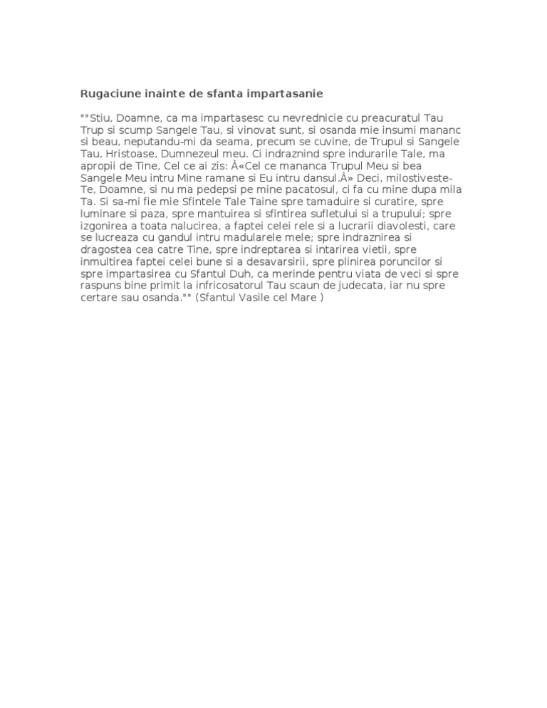 Rugaciune inainte de impartasanie. Rugaciunile inaintea sfintei impartasanii imparate ceresc mangaietorule duhul adevarului care pretutindenea esti si toate le implinesti vistierul bunatatilor si datatorule de viata vino si te salasluieste intru noi si ne curateste pe noi de toata intinaciunea si mantuieste bunule sufletele noastre. Ci stăpâne iubitorule de oameni care pentru noi ai murit și ai înviat și ai dăruit nouă aceste înfrico șătoare și de viață făcătoare taine spre binefacerea și sfințirea sufle te lor și a trupurilor noastre dă să mi fie și mie acestea spre tămăduirea sufletului și a trupului spre izgo ni rea a tot potriv nicul. La loc cu pasune acolo m a salasluit. Rugaciuni înainte de spovedanie.