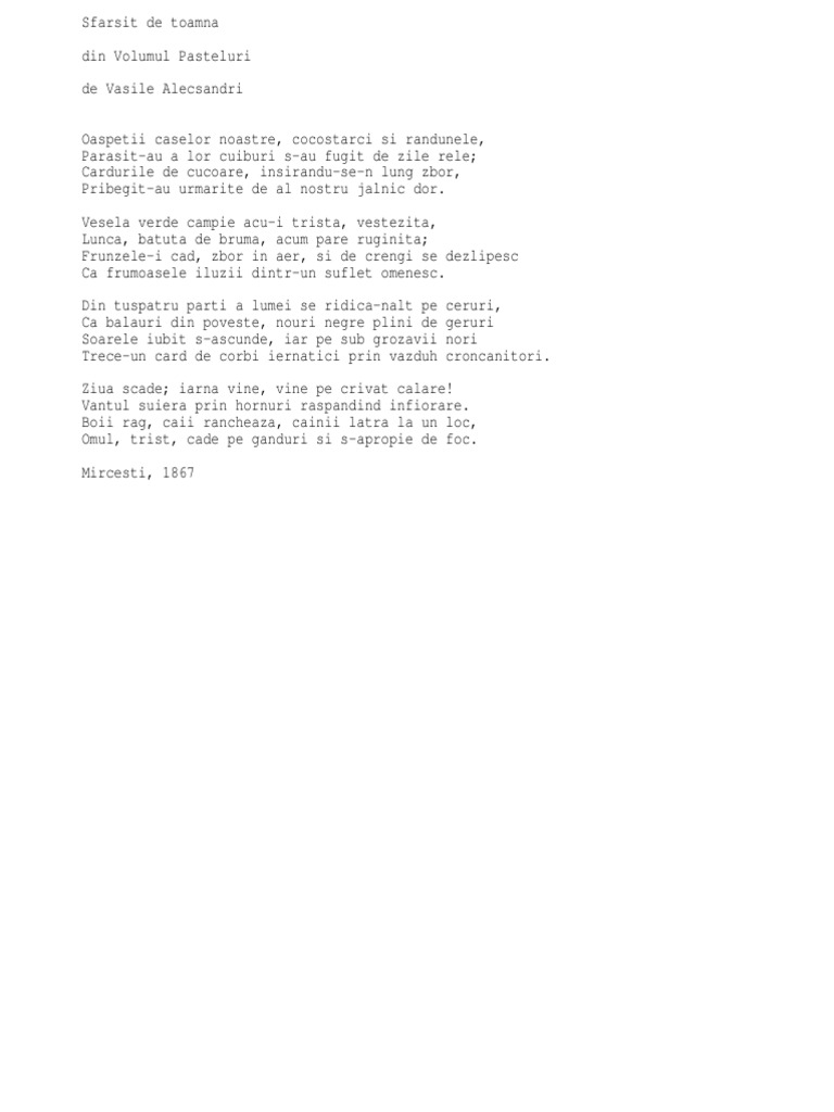 Sfarsit de toamna de vasile alecsandri. Vasile alecsandri serile la mircesti duration. Versuri sfarsit de toamna de vasile alecsandri. Cardurile de cucoare insirandu se n lung zbor. Oaspeţii caselor noastre cocostârci şi rândunele părăsit au a lor cuiburi ş au fugit de zile rele.