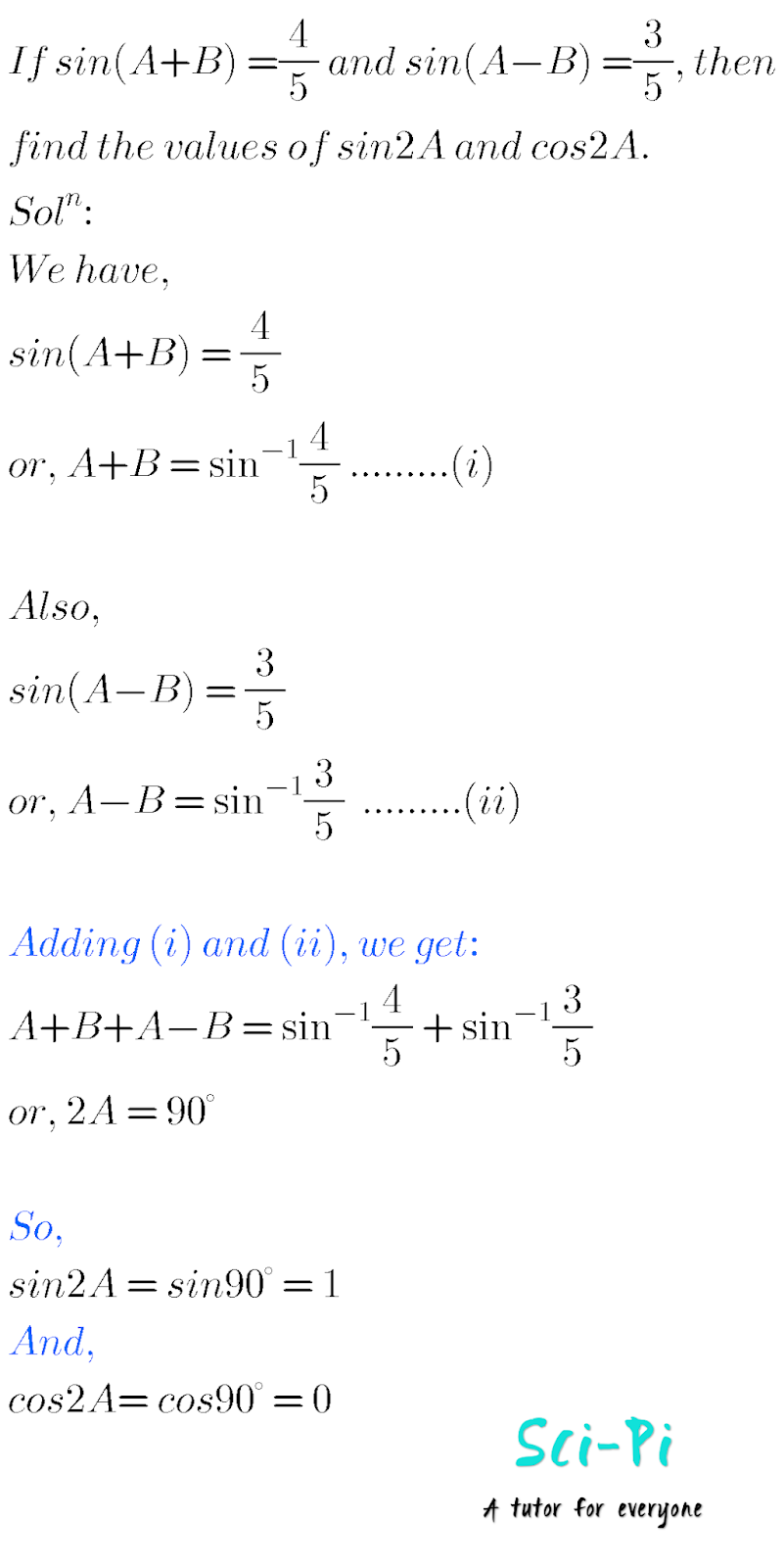 If Sin A B 4 5 And Sin A B 3 5 Then Find The Values Of Sin2a And Cos2a Trigonometric Ratios Of Compound Angles Trigonometry Sci Pi Sci Pi Science And Mathematics Notes With Solutions