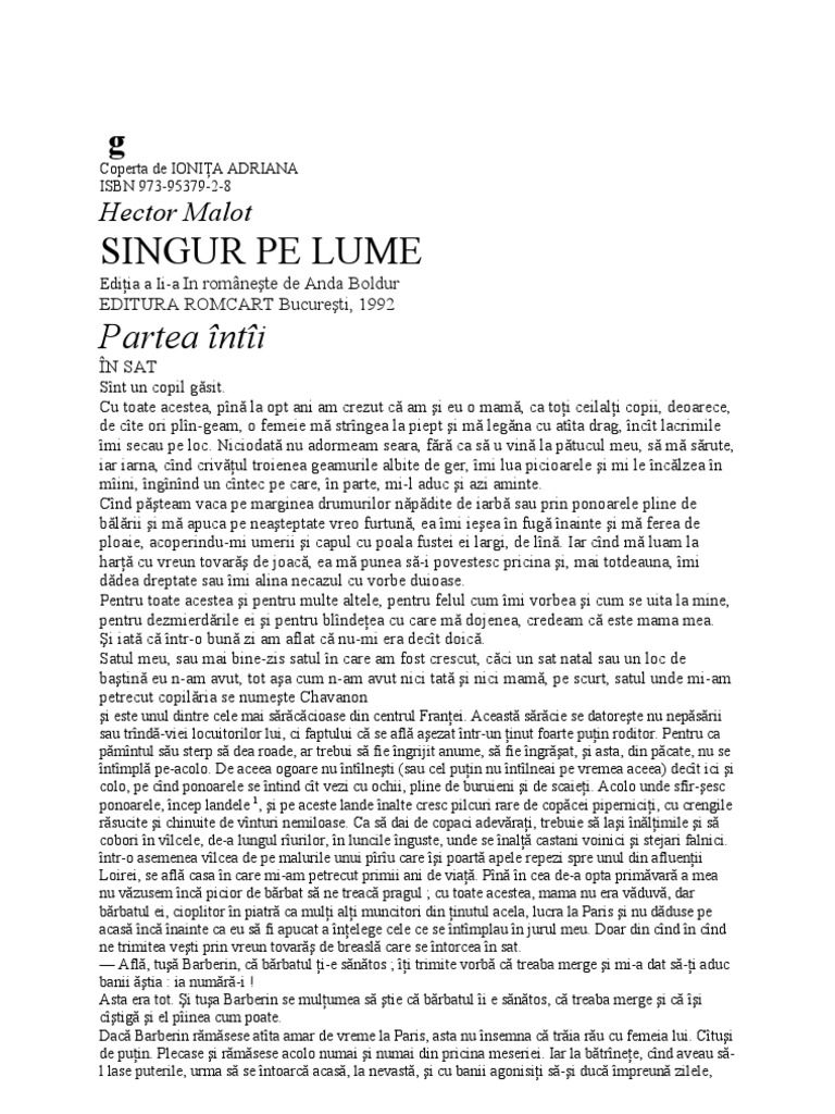 De mic copil a crezut că aceea care îl îngrijea cu multă dragoste tușa barberin este mama lui. Singur pe lume de hector malot rezumat de opt ani remi traieste la buna mama barberin la chavarron in masivul central dar atunci cand sotul acesteia jerome zidar la paris revine acasa ranit in urma unui accident si ruinat copilul afla ca mama barberin nu este mama sa adevarata si ca de fapt este un copil abandonat. Prima parte capitolul i în sat. Singur pe lume este numele unui roman scris de hector malot unul dintre cei mai cunoscuți scriitori francezi malot este autorul a peste șaptezeci de volume iar cel de față a fost publicat pentru prima data în anul 1878.