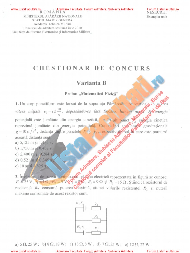 Listafacultati Ro Subiecte Admitere Academia Tehnica Militara Bucuresti Matematica Fizica Var B 2010