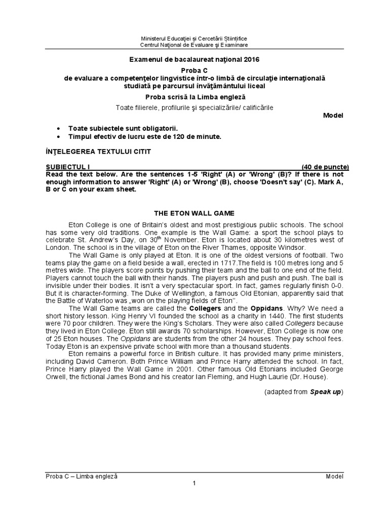 Subiecte Bac 2016 Subiecte La Proba De Competenţe Lingvistice Limba Engleză