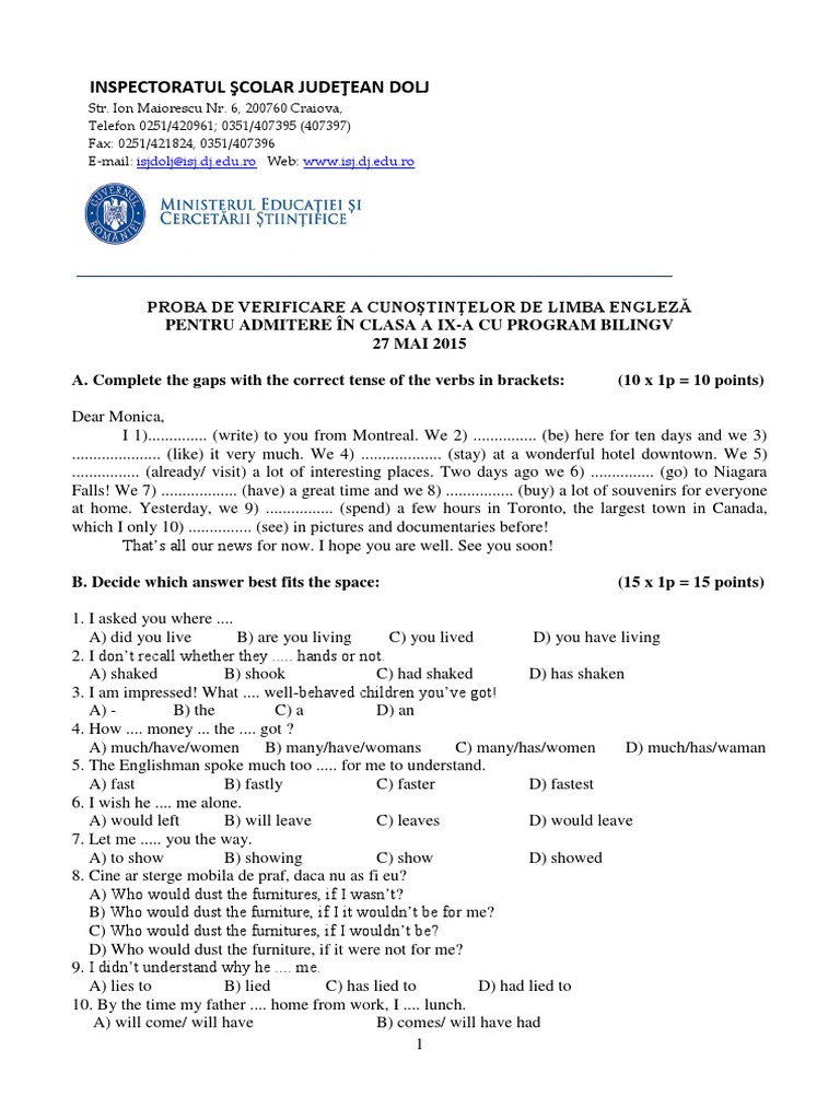 Testul De Competențe Lingvistice Pentru Admiterea In Clasa A Ix A Bilingv Engleză Colegiul National Octavian Goga Sibiu