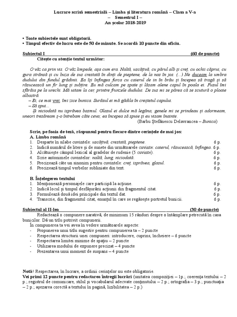 Teza La Romana Clasa 5 Semestrul I
