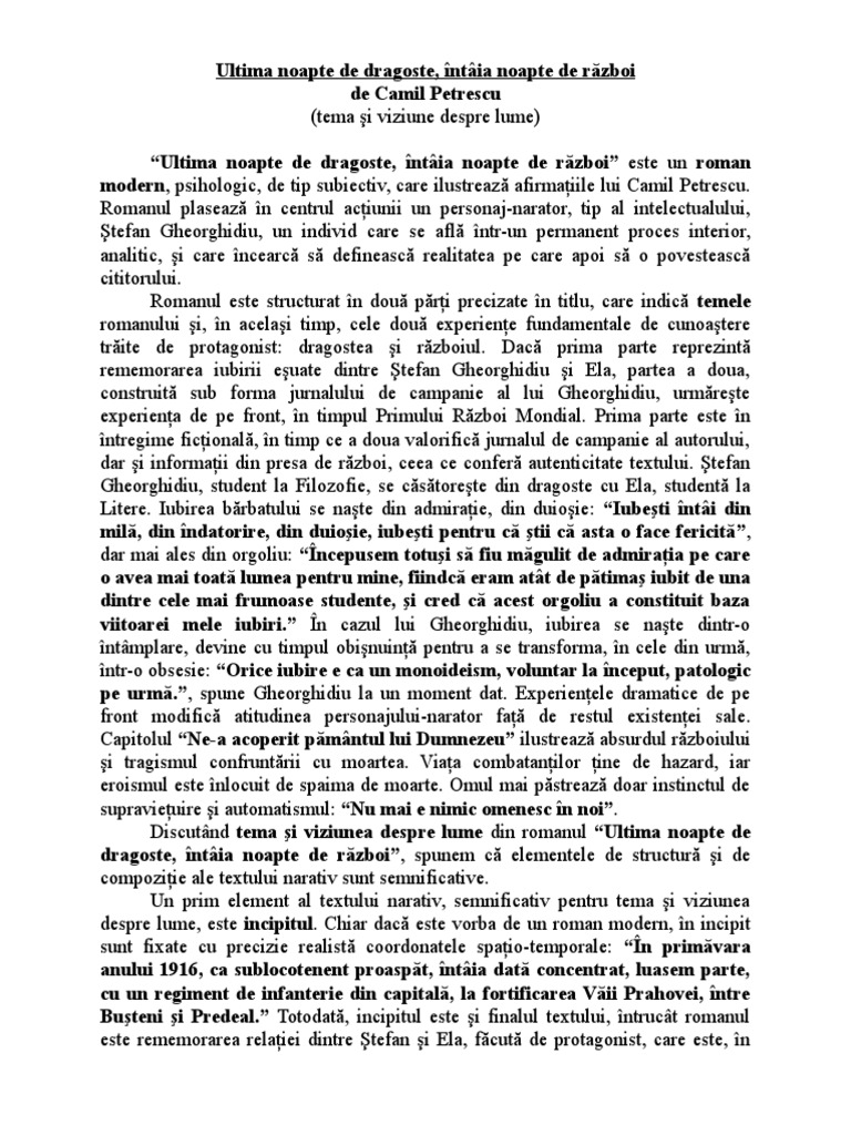 Tema Si Viziunea Despre Lume Ultima Noapte De Dragoste Intaia Noapte De Razboi De Camil Petrescu Sidonia Elena Academia Edu