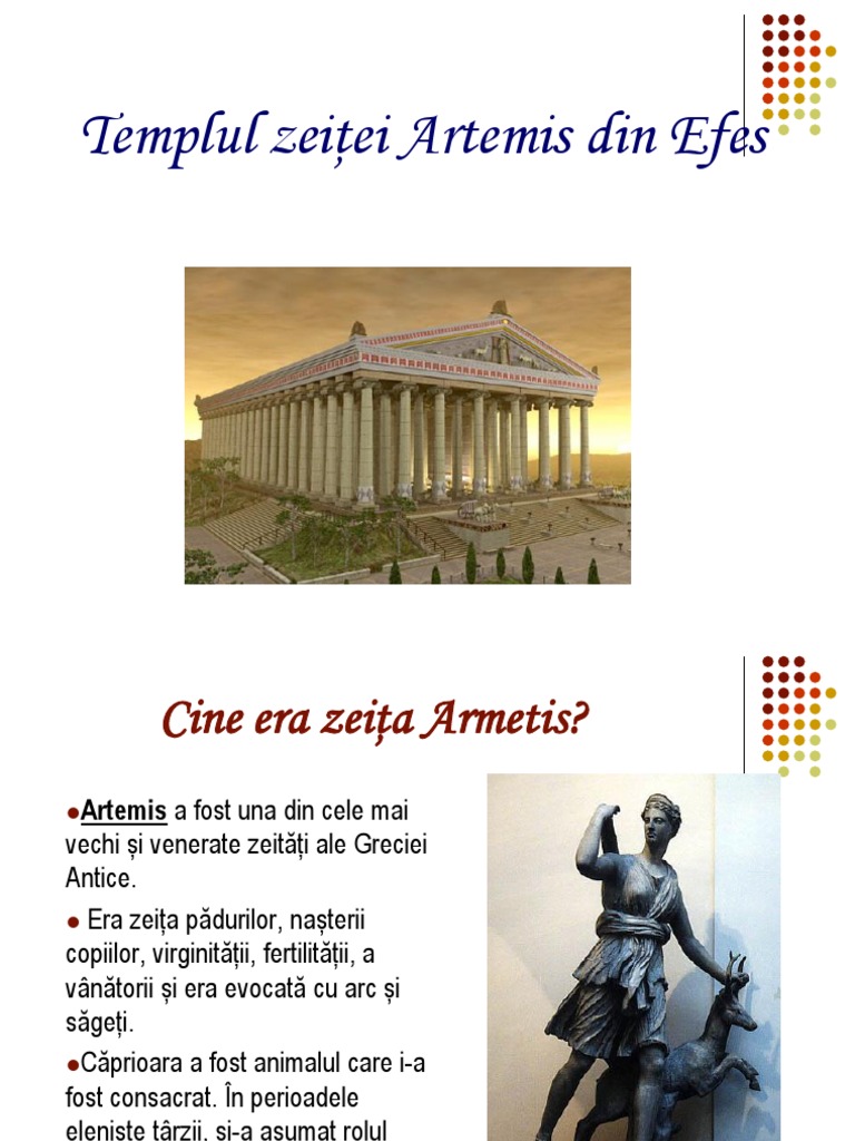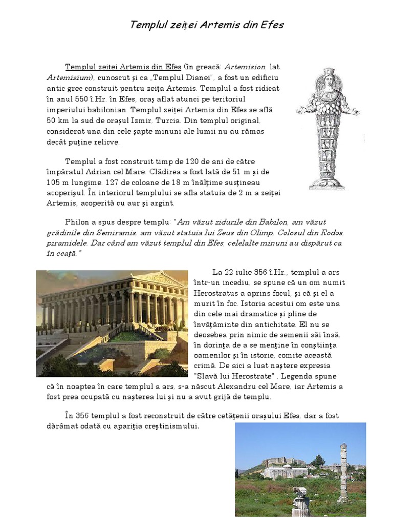 Templul zeitei artemis din efes in asia mică la efes patria filosofului heraclit se afla templul artemisei diana la romani zeita naturii ocrotitoarea vânătorilor si păstorilor iar mai târziu a. Artemisium cunoscut și ca templul dianei a fost un edificiu antic grec construit pentru zeița artemis. în urma flăcărilor au mai rămas numai câteva statui ca dovadă a ceea ce este recunoscut drept una dintre cele şapte minuni ale lumii antice. Templul a fost un edificiu antic grec construit pentru zeiţa artemis in anul 550 i h in orasul efes aflanduse in acea perioada pe teritoriul imperiului babilonian templul zeiţei artemis din efes se afla la 50 de km la sud de oraşul izmir din turcia si este considerat una din cele sapte minuni ale lumii.
