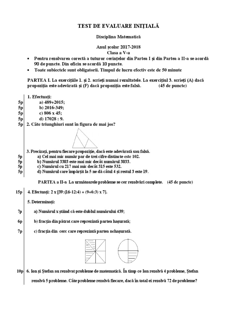 Test De Evaluare Intial Clasa A 5 A Matematica