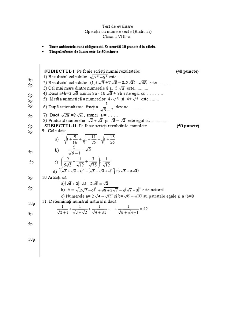 Test Calcul Algebric Descompuneri Cls A Vii A