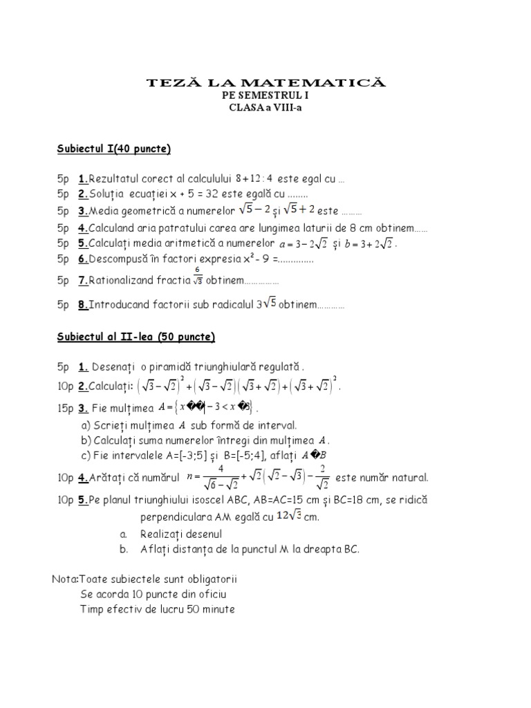 Teza Matematica Cls Viii Sem I